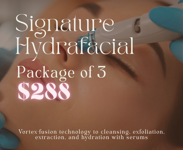 Hydrafacial Toronto, get 3 Signature Hydrafacials for only $288 for a limited time! 30 minutes of deep cleansing, exfoliation, extraction, and hydration with serums and advanced Vortex-Fusion technology.
